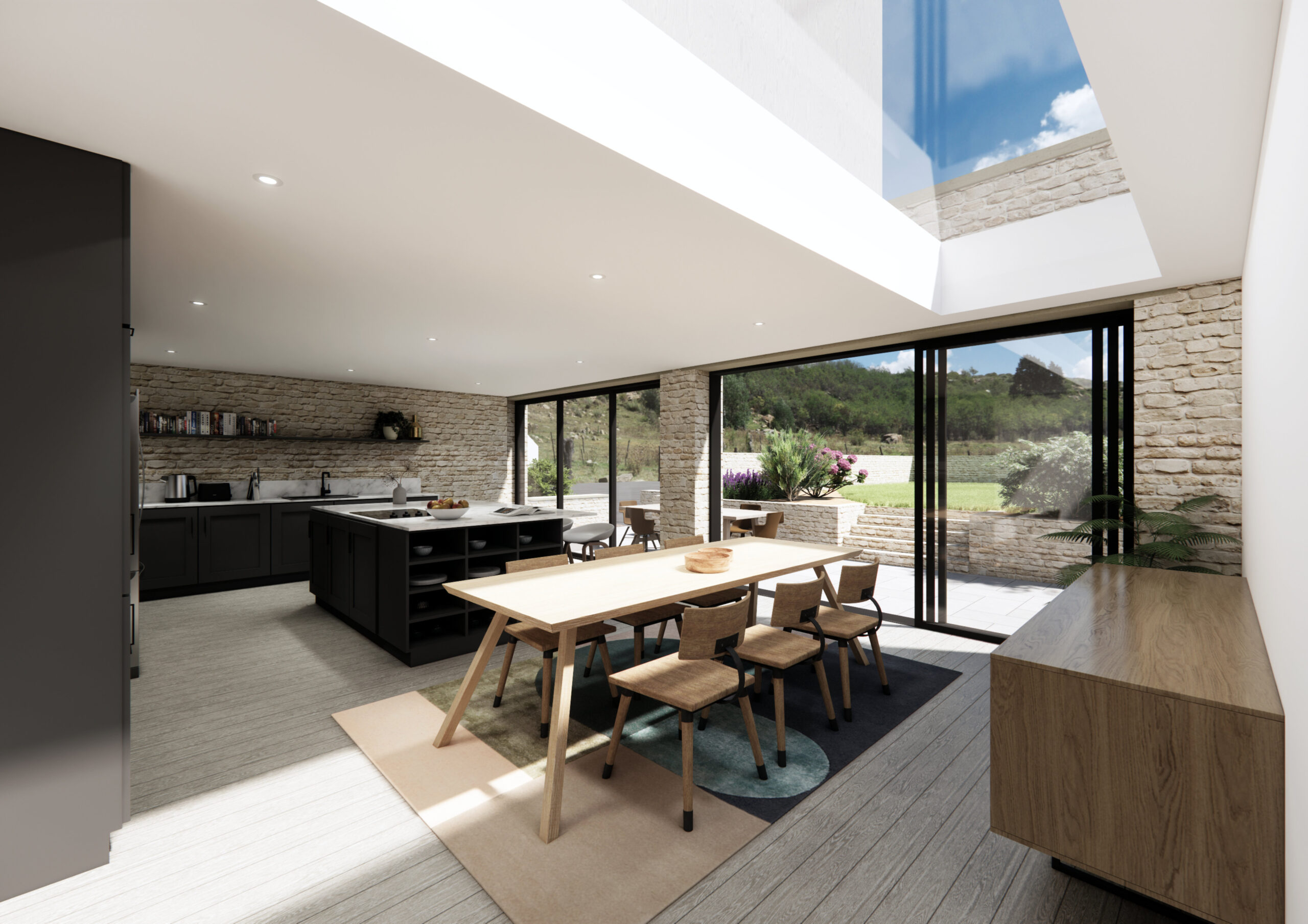 One of the key challenges of this project was integrating the new extensions in a way that respects the surrounding village character while introducing modern design elements. The proposed material palette was carefully selected to achieve this balance. Hardwood timber cladding was chosen to weather naturally over time, softening the appearance and complementing the existing stonework. Slate roofing provides durability and aligns with the consistency of the original homes. High-performance double glazing enhances thermal efficiency while maintaining the character of the façade.